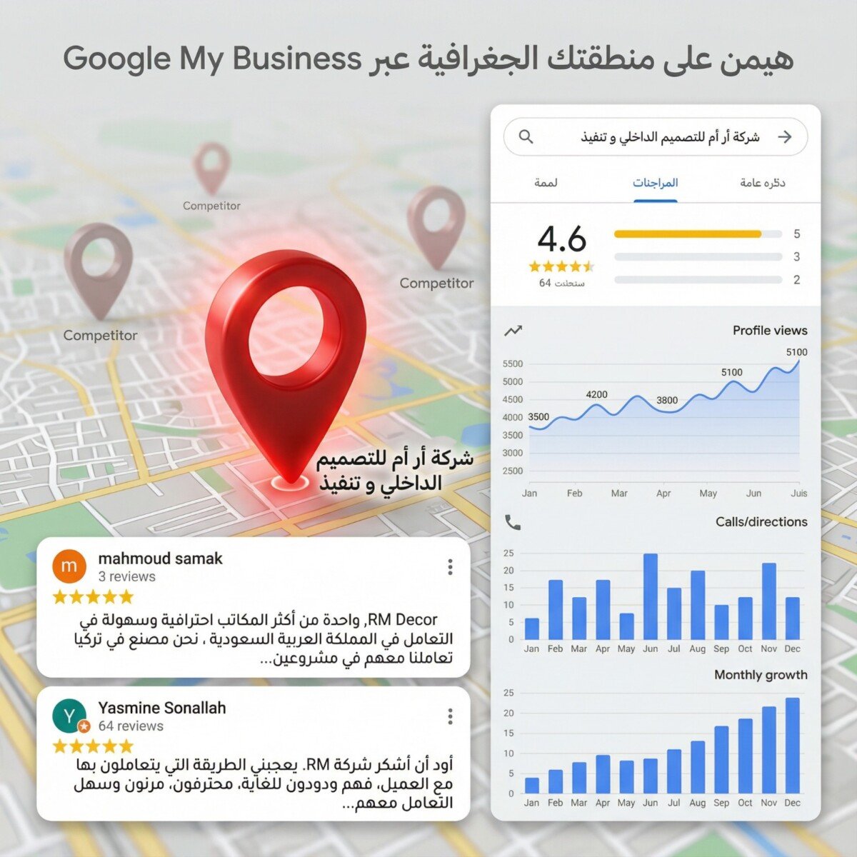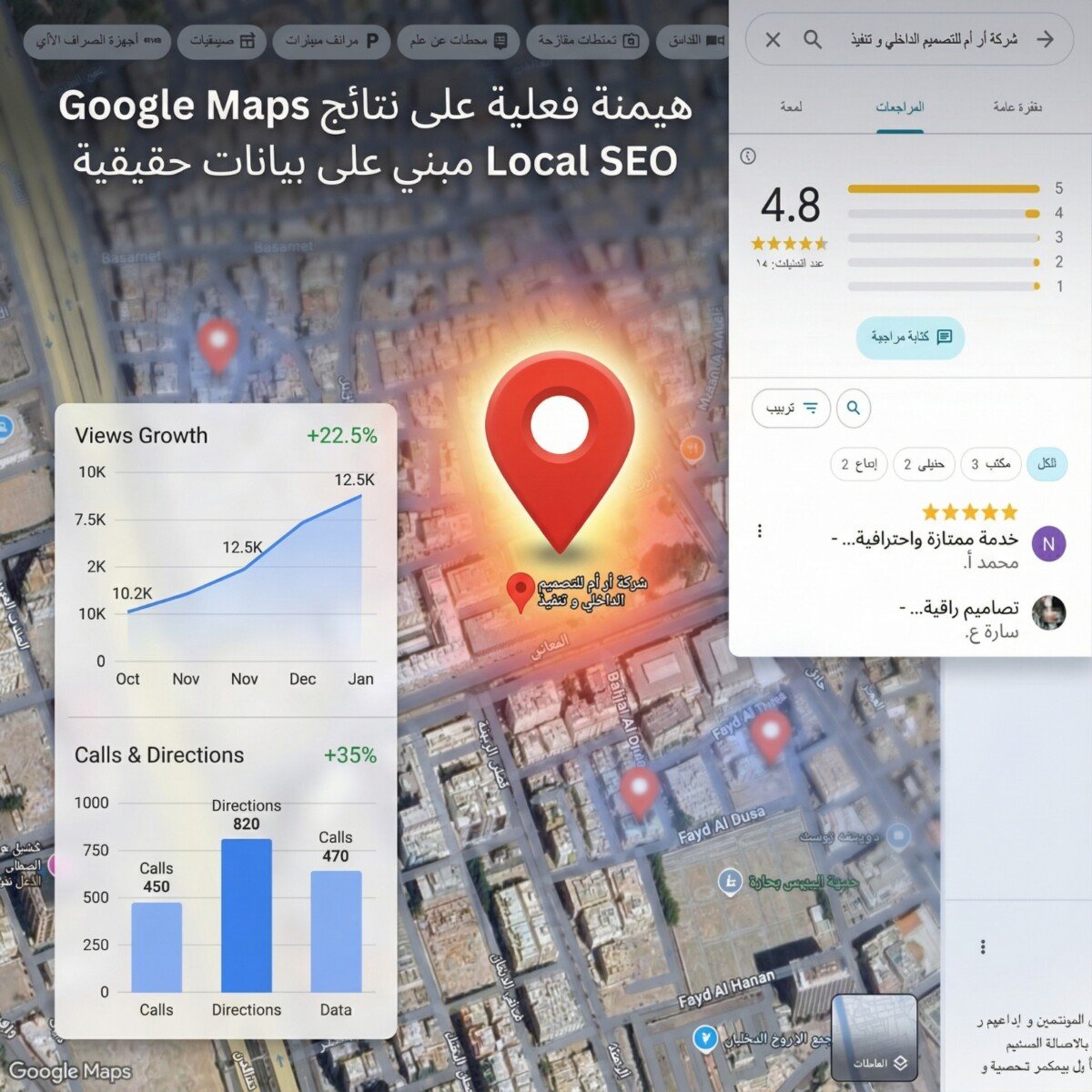 التقييمات هي العامل رقم 1 في السيو المحلي. نحن لا نتركها للصدفة، بل نضع لك استراتيجية عملية لتحفيز عملائك على كتابة التقييمات بكثافة. والأهم من ذلك هو دورنا في "هندسة الردود": فنحن نقوم بالرد على كل تقييم بصياغة ذكية تحتوي على كلمات مفتاحية مستهدفة (Keyword-Rich Responses)، مما يرسل إشارات قوية لجوجل تربط نشاطك بتلك الخدمات وترفع ترتيبك في الخرائط فوراً.