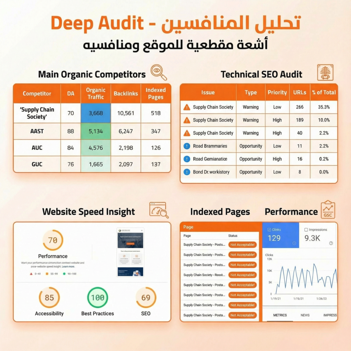 نعمل على مراقبة المواقع بشكل يدوي وآلي في نفس الوقت على مدار الساعة لفحص الروابط المعطلة (Broken Links) وسرعة الصفحات (Core Web Vitals)، وترسل لنا تنبيهات فورية لإصلاح أي خلل قبل أن يؤثر على ترتيبك.