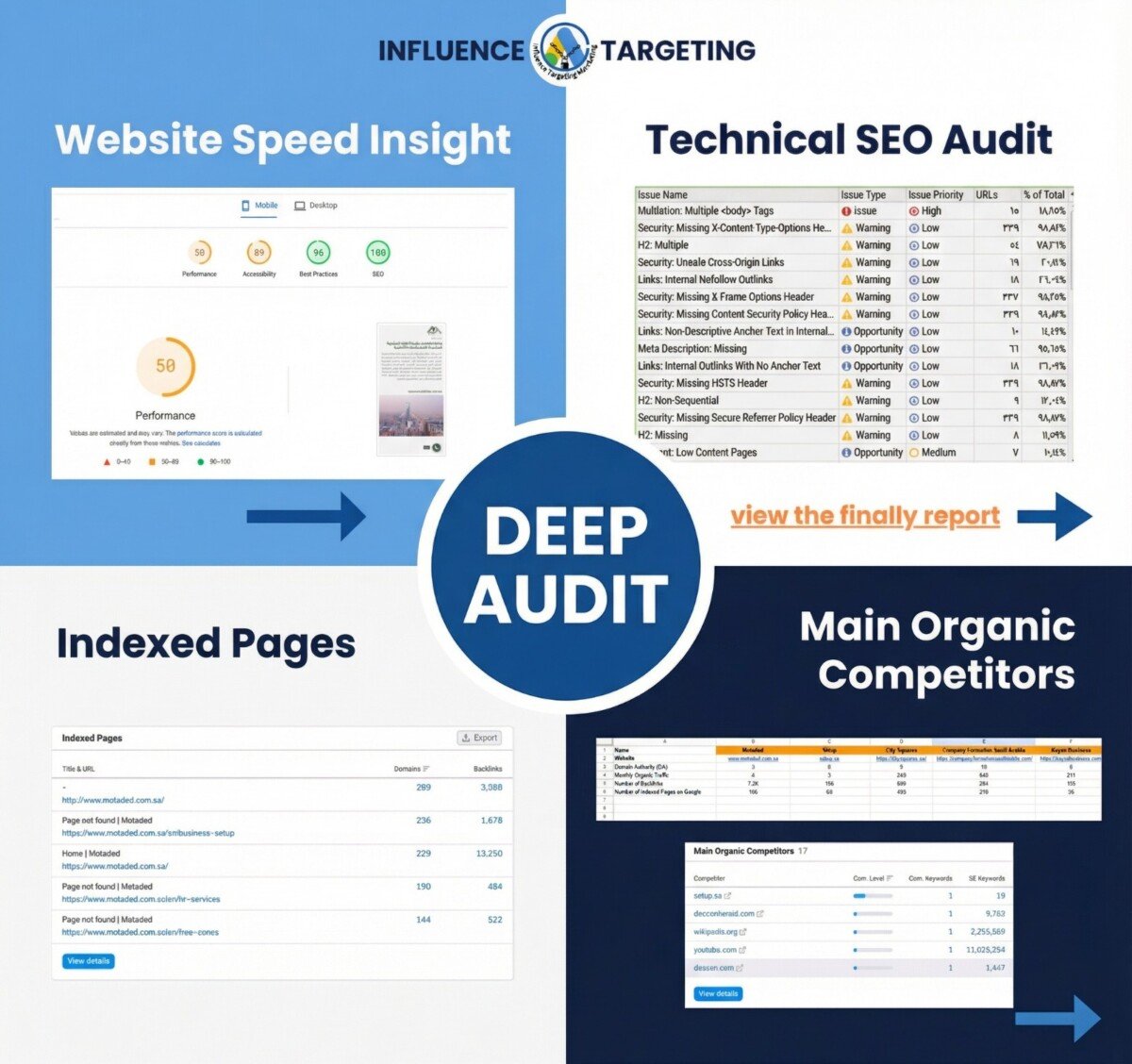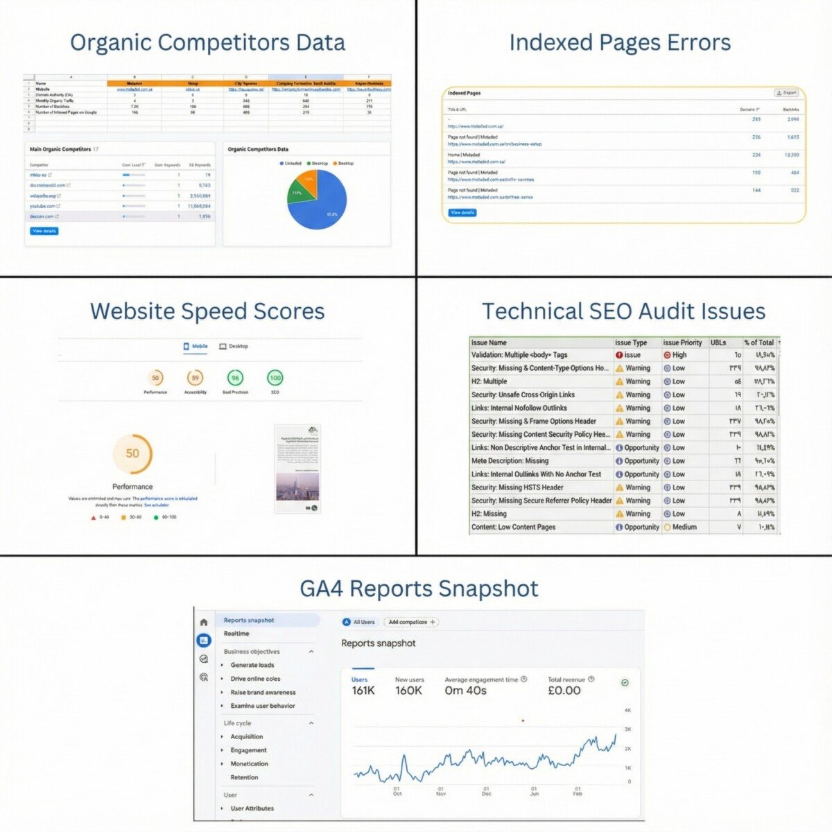 ليس بالضرورة في كل الحالات، فنحن نحاول أن نستخدم دائمًا "أنظمة تحليل ذكية" خاصة بنا تمسح آلاف الصفحات وتقارن موقعك بالمنافسين بدقة متناهية، مما يمنحنا رؤية شاملة للفرص التي يغفل عنها الآخرون، ونحول هذه البيانات إلى خطة نمو مضمونة.