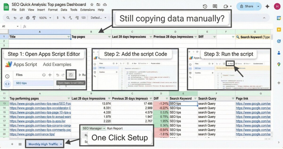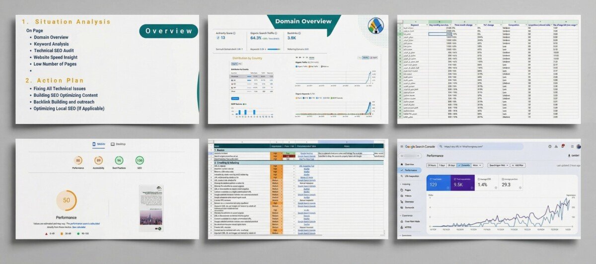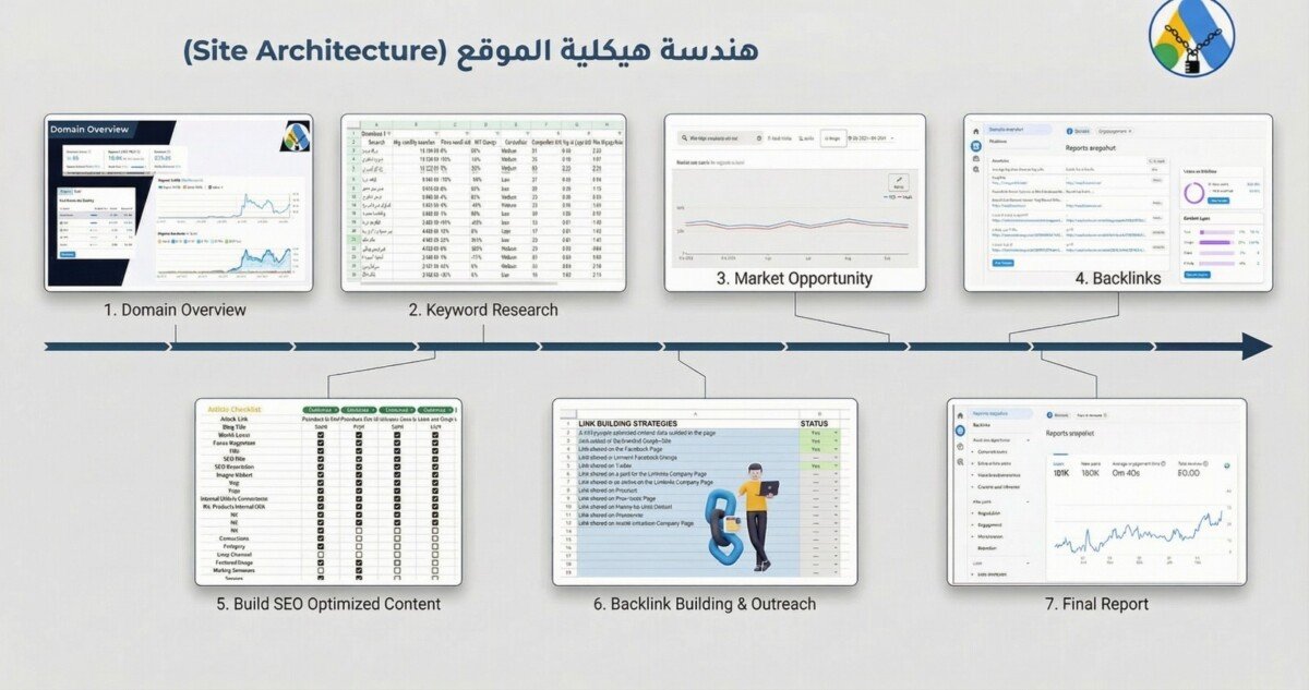 لا نقوم بإرسال ملفات PDF مبهمة، بل ستحصل على رابط لملف "خطة العمل الحية" (Action Plan) عبر Google Sheets. يحتوي الملف على تبويبات دقيقة تظهر لك كل شيء: من التخطيط (Planning)، تحليل الكلمات (Blogging)، التدقيق التقني (Pre & Post Analysis)، وحتى الروابط الخارجية، لتراقب التطور لحظة بلحظة.