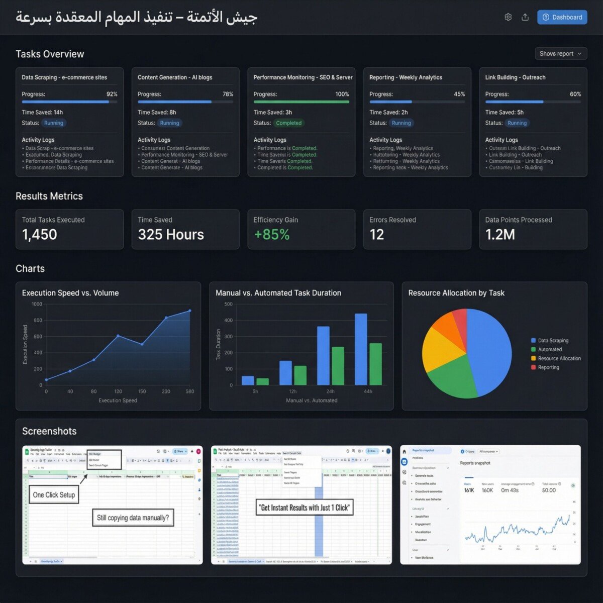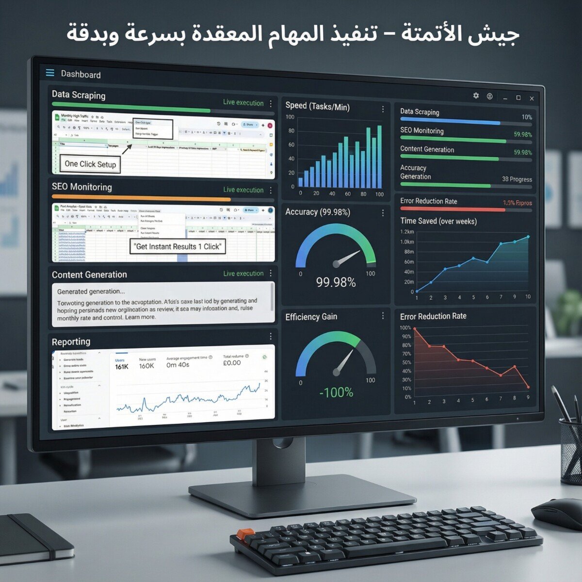 الأتمتة تعني أننا سخرنا التكنولوجيا للقيام بالمهام الروتينية الشاقة بسرعة ودقة تفوق البشر. بدلاً من قضاء ساعات في جمع البيانات يدوياً، تقوم أدواتنا بذلك في دقائق، مما يتيح لفريقنا التركيز على "التفكير الاستراتيجي" والإبداع لتحقيق أهدافك.